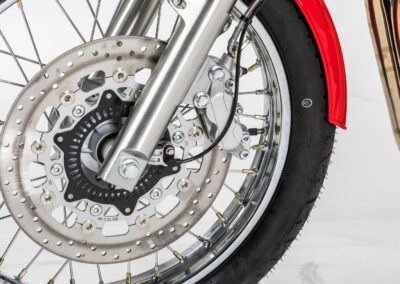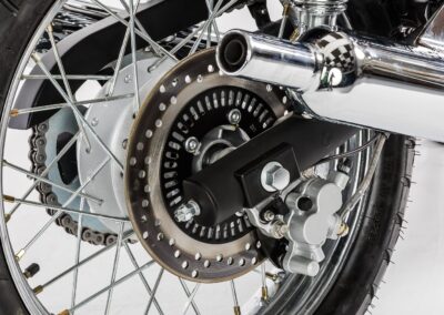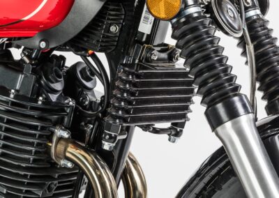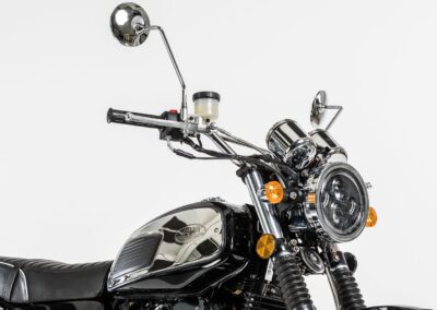 The flexible single-cylinder engine almost asks to be used in a more enduro-style motorcycle. This is exactly what we had in mind when we designed the JAWA 650 OHC Sport. The chassis of this model is identical to the JAWA 650 OHC, but thanks to the adjustable front mudguard, the larger space between the rear wheel and the mudguard, and the handlebar with a cross bar and a stylish roll, you can safely enjoy riding on roads of a lower quality compared to JAWA 650 OHC. The drop-shaped tank combined with a raised muffler directly link its design to JAWA’s historic motorcycles designed for “Six Days” races.